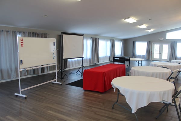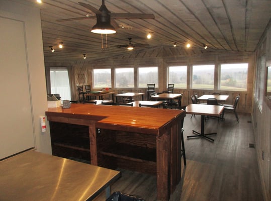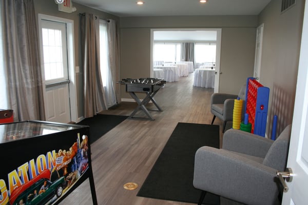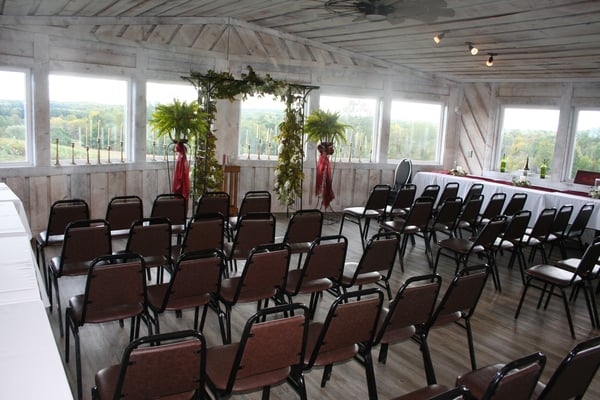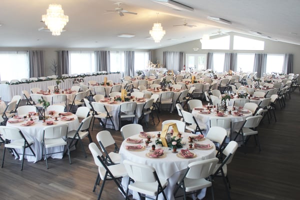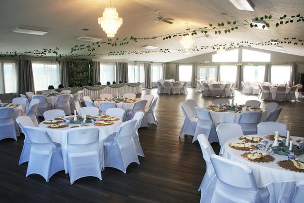Indoor tables, indoor chairs, and use of the commercial kitchen are all included, along with a variety of basic decorations available for use.